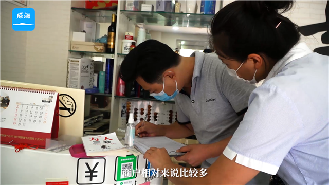 ??????日常巡查對蔡娟來說更是日常便飯,“戴口罩、測體溫、查驗健康碼”每進到一家商戶,蔡娟都要囑咐一句,消殺用品的使用和擺放,她更要實地看一看?!懊廊菰?、理發店、餐飲、超市,這都是人流密集型場所,一定要檢查仔細。”