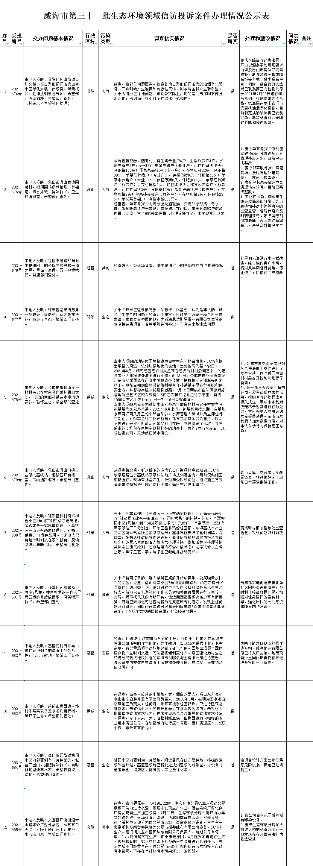 ??????威海市第三十一批生態環境領域信訪投訴案件交辦清單共計12件。截至8月17日17時,已全部辦結,其中屬實10件,不屬實2件。