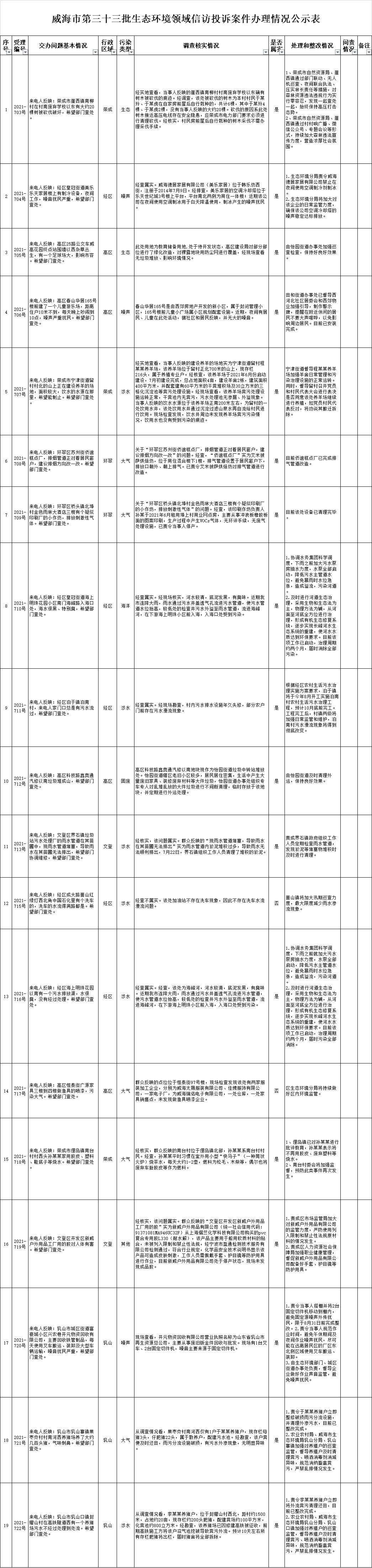 ??????威海市第三十三批生態環境領域信訪投訴案件交辦清單共計20件。截至8月17日17時,已辦結19件,其中屬實17件,不屬實2件。