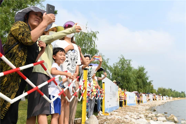 ??????岸邊,前來看賽的居民們大飽眼福,紛紛舉起手機拍照留念。南海新區金海城小區的居民閆含一早便帶著孩子前來觀賽,年年看龍舟賽成了一家人的“儀式感”。閆含說:“今年的比賽推遲了,我們都盼著等著這個活動呢,孩子很喜歡看,還能讓他們感受傳統文化的魅力。”