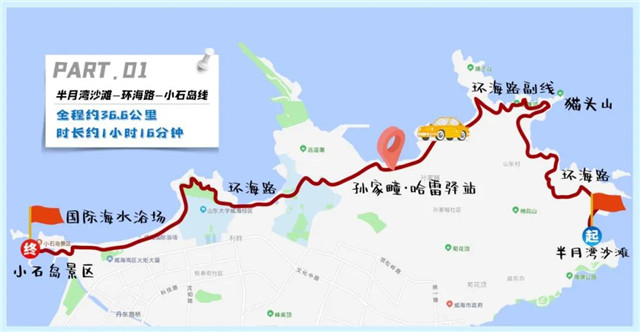 詳細路線:海源公園—中國油畫小鎮—環海路—貓頭山觀景臺—孫家疃·哈雷驛站—威海市環海路—國際海水浴場—火炬八街—小石島景區