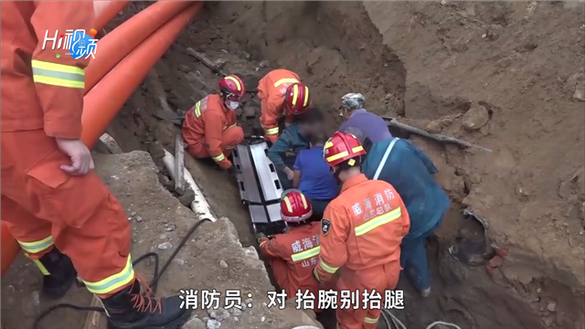 救援人員到場后了解到,被困工人在電力管道施工過程中,因周邊土方滑塌而掉落坑道內,腿部被石板壓住,消防員立即實施處置。