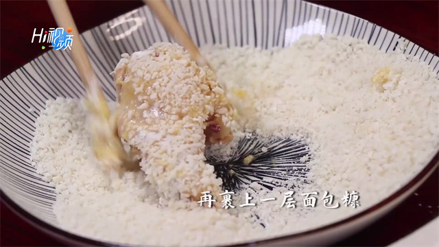 ??????2、裹面粉的順序千萬不能錯,裹上面粉和蛋清能夠鎖住雞肉的汁水,最后撒上面包糠是外皮酥脆的重要原因。