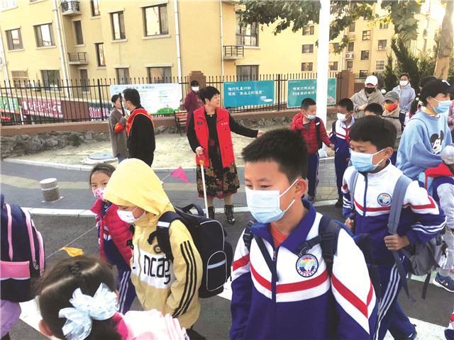 ??????10月19日早,在曲阜學校西的道路交叉口紅綠燈處,社區志愿者蘆英正在協助曲阜學校的老師引導交通秩序,確保學生安全過馬路。