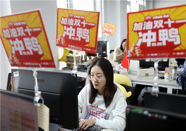 ??????“補貨的車開進來了,大家準備卸貨!”11月3日下午,今年“雙十一”的首波攻勢即將鳴金收兵,漢鼎品牌產(chǎn)業(yè)園里的電商人依然沒有停止忙碌。置身于此,“雙十一”的緊迫感撲面而來。