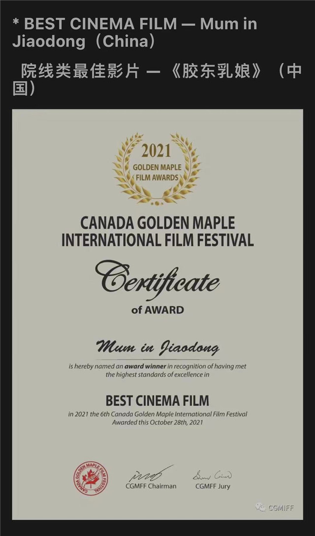 ??????11月5日,第六屆金楓葉國際電影節單項獎獲獎名單揭曉,影片《膠東乳娘》獲院線類最佳影片、院線類最佳原創音樂兩項大獎,其中獲獎的原創音樂由戚建波創作。