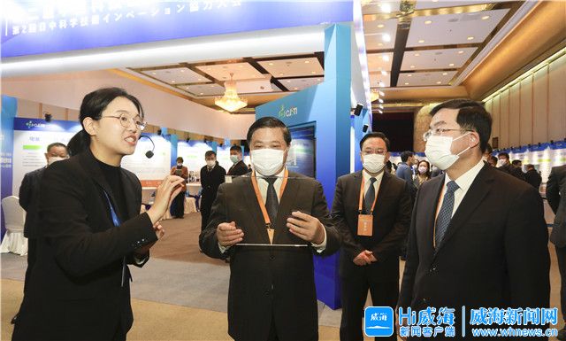 ??????會前,唐波到中日(山東)科技創新成果展巡展,仔細詢問展品性能、研發、應用等相關問題,了解產業核心技術、裝備與科研成果。張海波、閆劍波、侯世超、孫付春參加相關活動。(Hi威海客戶端記者 楊彩明/文 孫大偉 王彥博/圖)