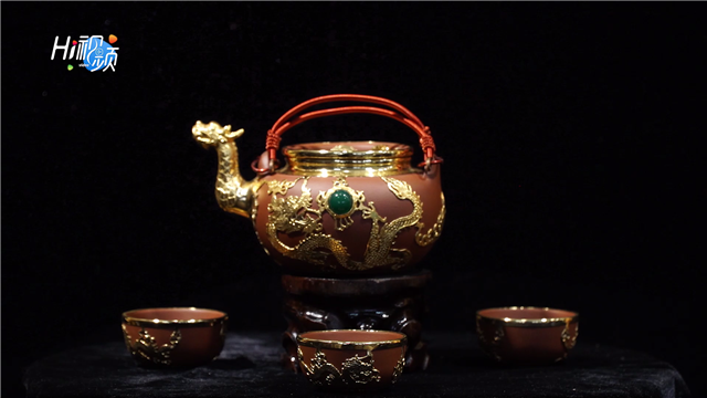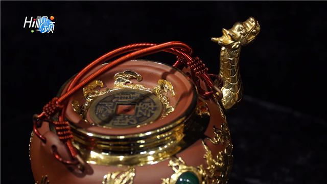 ??????作品龍騰四海錫嘴壺采用宜興紫砂為載體,用純錫制作一個龍頭壺嘴安置在紫砂上,壺蓋嵌有銅錢,整個茶具大氣,寓意中華龍騰四海。
