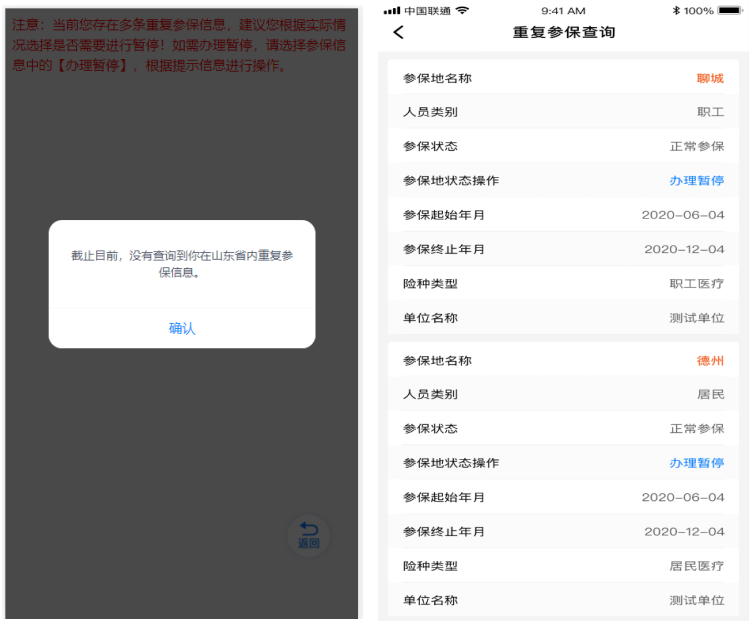 ??????如果參保人員未重復(fù)參保,提示截止目前,沒(méi)有查詢(xún)到你在山東省內(nèi)重復(fù)參保信息。如果參保人員重復(fù)參保,會(huì)出現(xiàn)下面重復(fù)參保查詢(xún)界面。
