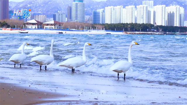 ??????初春時節,在經開區九龍灣海域,白浪淺涌中,成群結隊的白天鵝、海鷗等鳥類在水中游弋,它們優雅的姿態,給春寒料峭的海邊平添了無限生機。