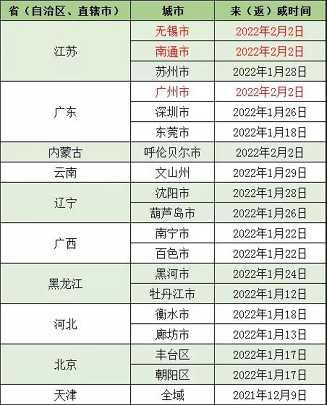 ??????自無錫市、南通市、廣州市、呼倫貝爾市、文山州、北京市(豐臺(tái)區(qū)、朝陽(yáng)區(qū))、蘇州市、沈陽(yáng)市、葫蘆島市 、南寧市、百色市、黑河市、深圳市、東莞市、衡水市、廊坊市、牡丹江市、天津市(全域)等發(fā)生本土疫情地區(qū)的入(返)威人員,與已公布的陽(yáng)性感染者活動(dòng)時(shí)空軌跡重疊人員,到過或途經(jīng)中高風(fēng)險(xiǎn)地區(qū)人員,請(qǐng)第一時(shí)間主動(dòng)向所在社區(qū)(村)、住宿賓館和單位報(bào)備,配合落實(shí)屬地疫情防控指揮部管控措施和相應(yīng)核酸檢測(cè)要求。