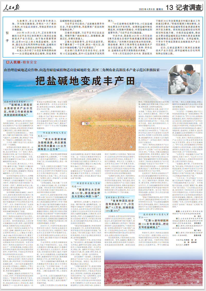 ??????《人民日報》2022年4月8日13版刊發《由治理鹽堿地適應作物,向選育耐鹽堿植物適應鹽堿地轉變,黃河三角洲農業高新技術產業示范區積極探索——把鹽堿地變成豐產田》一文,全文如下: