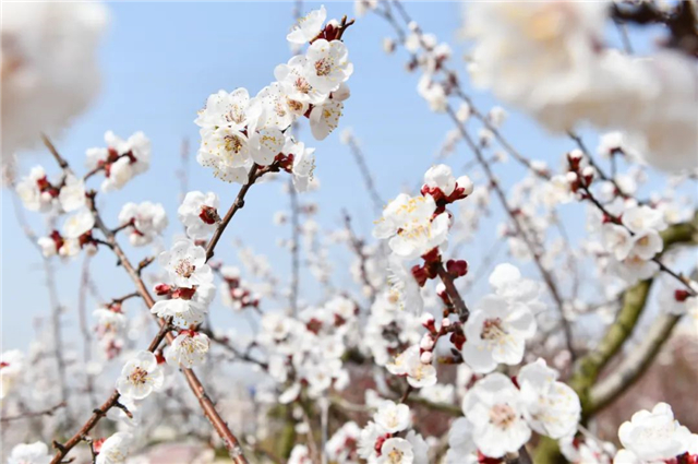 ??????在拾光園里,潔白如雪的杏花競相綻放,香氣沁人心脾,吸引著蜜蜂在花間飛舞采蜜。春風微拂,星星點點的花朵隨風舞動,展示出獨有的魅力。