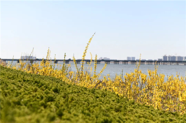 ??????沿南海新區主干道一路驅車前行,吐露新芽的柳樹很是吸睛,“垂柳如煙”的景致近在咫尺,黃綠色的嫩芽一片朦朧,如煙似霧。陽光照射下的香水河面,波光粼粼,微風徐徐,令人心曠神怡,河畔一簇簇連翹花開得正旺,沿河岸綿延鋪開,遠遠望去,仿佛置身金色的海洋。