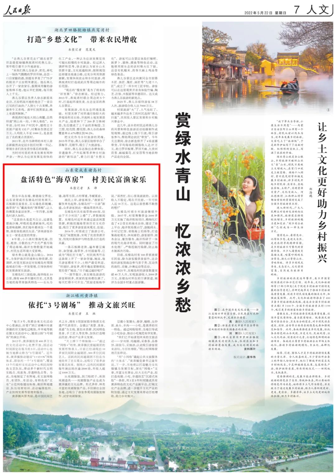 ??????5月22日出版的《人民日報》第7版,以《盤活特色“海草房” 村美民富漁家樂》為題,點贊威海榮成東楮島村盤活特色“海草房”,讓游客仿佛置身童話世界,村莊變美村民致富。以下為報道全文——