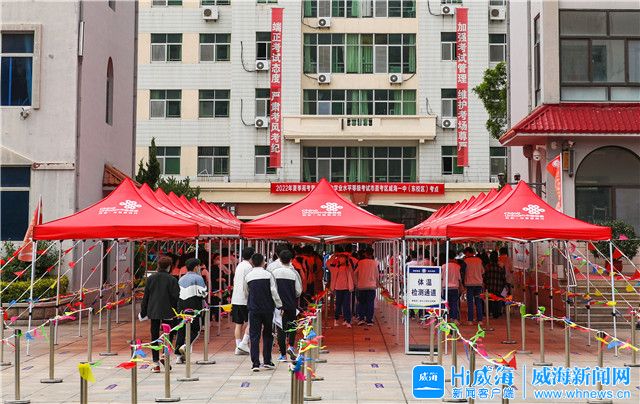 ??????6月6日下午3時許,在威海一中(東校區)考點外,前來熟悉考場環境的考生們正按照帶隊老師的提醒,依次核對手里的參考“憑證”,模擬入場流程。與往年不同,入場憑證中增加了48小時內和24小時內兩份紙質核酸檢測陰性證明。