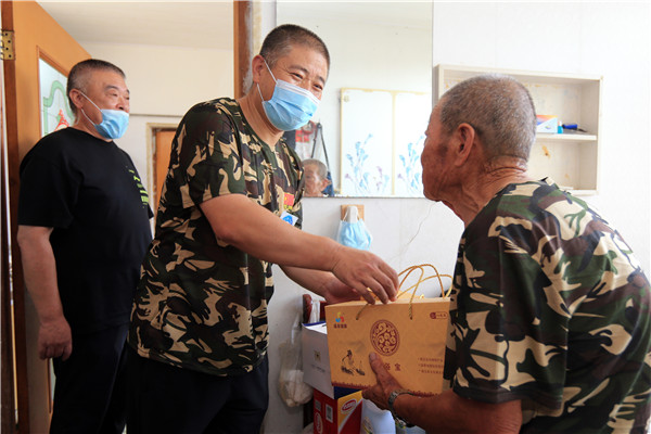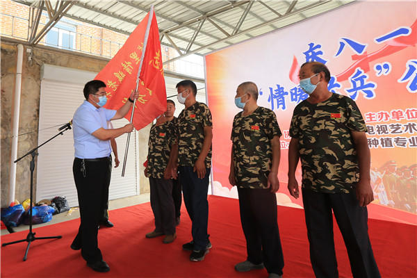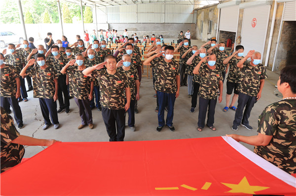 ??????7月25日,在山東省榮成市上莊鎮(zhèn)鋪里村,退伍軍人們向軍旗敬禮。在第95個(gè)建軍節(jié)即將到來(lái)之際,山東省榮成市心連心社工中心和山東省榮成市上莊鎮(zhèn)鋪里村退役軍人服務(wù)站舉行“慶'八一' 憶初心”暨“情暖老兵 關(guān)愛(ài)幫扶”公益項(xiàng)目啟動(dòng)儀式。