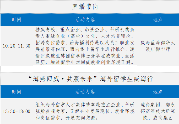 ??????在留學人才招聘版塊,組織線上“直播帶崗”“海燕回威·共贏未來”海外留學生威海行、企業招聘短視頻聯播等系列活動,邀請部分山東籍留韓學生現場參會,面向線上1300多名在韓留學生推介我市崗位需求,推動市內企事業單位與留學人才互動交流。