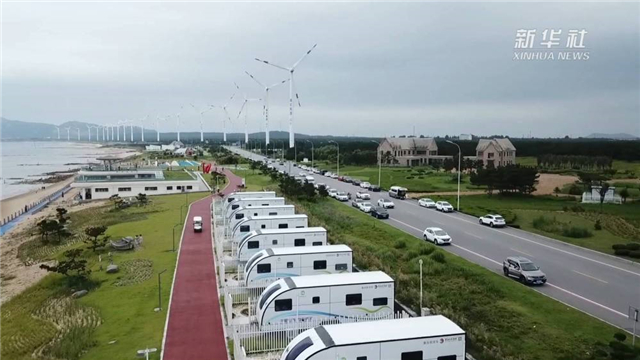 ??????這是一條休閑旅游的觀光之路,以路為景,以景引路。隨著暑期到來,在威海榮成小五隊·抱海驛站旁,綿延浪涌的海灘和獨具特色的房車營地,吸引著大量游客慕名而來。