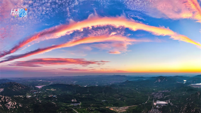 ??????8月17日傍晚,文登區上空忽現三道長條奇云,自東向西通向昆崳山頂,轉眼又變彩霞飛滿天,繽紛萬狀、色彩奇艷。婀娜多姿的霞光云氤,彌漫大半個天空,令人嘆為觀止。