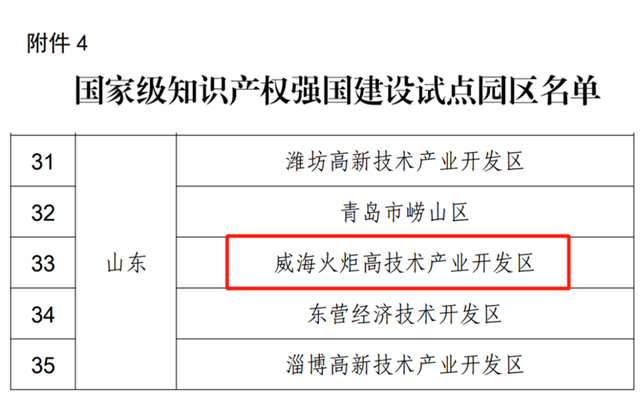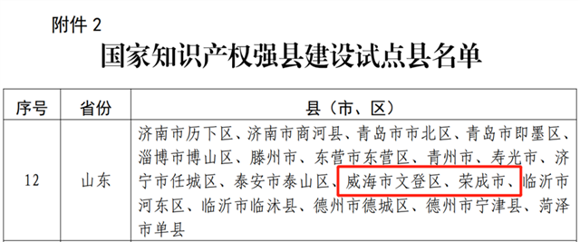 ??????威海市文登區(qū)、榮成市,被確定為國家知識產(chǎn)權(quán)強(qiáng)縣建設(shè)試點(diǎn)縣(市、區(qū)),威海火炬高技術(shù)產(chǎn)業(yè)開發(fā)區(qū)被確定為國家級知識產(chǎn)權(quán)強(qiáng)國建設(shè)試點(diǎn)園區(qū)。
