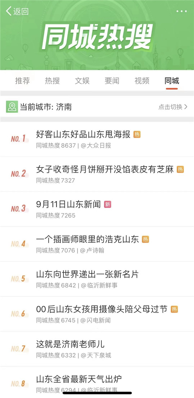 講好故事,要創新驅動。連日來,全省各級各類媒體創新生產、全媒傳播,形成主流輿論強勢。宣傳推介活動在北京舉行當日,大眾日報即在全網發起海報接力宣傳活動,#好客山東 好品山東甩海報#在山東16市均登上同城熱搜榜,其中12市位居熱搜榜首位,超高人氣的話題持續擴大宣傳聲量。中秋假期,由大眾日報主持的微博話題#山東有了新slogan#登上全國熱搜榜,2天時間總閱讀量就達到1.2億次,引發刷屏式傳播。