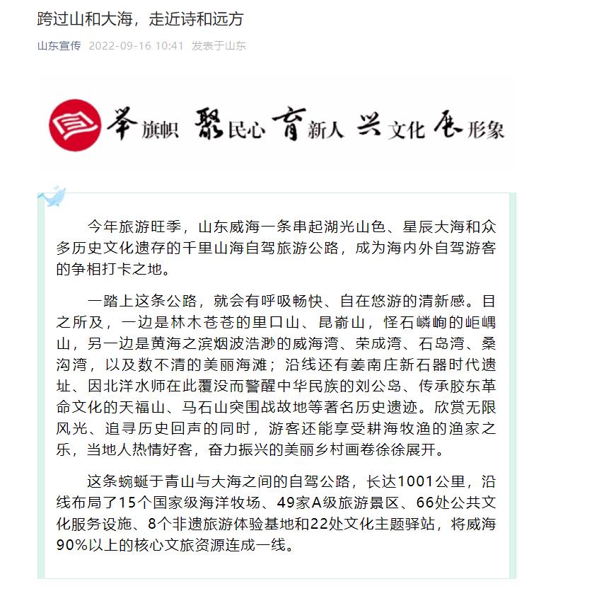 ??????9月13日,新華每日電訊以《跨過山和大海,走近詩和遠方》為題,聚焦威海千里山海自駕旅游公路。9月16日,“山東宣傳”轉載《跨過山和大海,走近詩和遠方》,對威海千里山海自駕旅游公路再次進行宣傳報道。以下為報道全文: