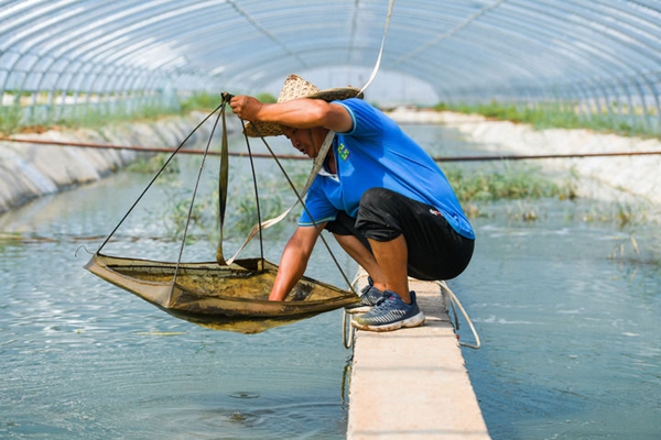 ??????8月25日,在地處黃河岸邊的內蒙古烏海市海南區巴音陶亥鎮的鹽堿水對蝦養殖園區,工作人員在查看對蝦生長情況。新華社記者 劉磊 攝