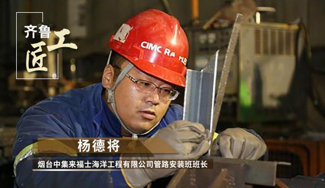 楊德將,煙臺中集來福士海洋工程有限公司一名管路安裝班班長。從1999年至今一直在中集來福士船廠車間工作。參加工作20多年來,他先后獲得“齊魯最美職工”“山東省勞動模范”“齊魯大工匠”“全國勞動模范”等多項榮譽稱號,獲得全國五一勞動獎章。