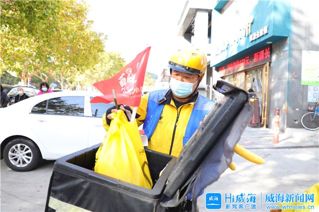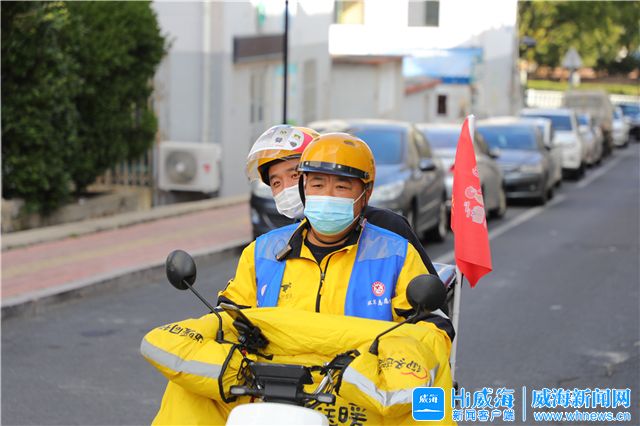 采訪王玉強的當天,正遇到環翠區鯨園街道送來了一批寫有“環翠志愿者”字樣的藍色馬甲。許多“小哥”趁著送餐間隙趕來,第一時間將藍馬甲穿在黃色外賣服的外面。“小哥”們說,少跑兩單沒關系,這份榮譽得“穿”上。