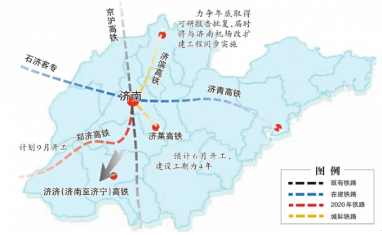 8月4日,濟南市召開新聞發布會對《濟南市“十四五”綜合交通運輸發展規劃》進行解讀、會上介紹,“到2025年,‘米字型’高鐵網基本形成,建成濟鄭高鐵、濟萊高鐵、黃臺聯絡線,推進濟濱高鐵、德商高鐵,實現省會經濟圈市市通高鐵,打造軌道上的省會經濟圈。”
