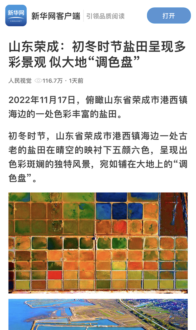 ??????? 11月18日,新華網(wǎng)以《山東榮成:初冬時(shí)節(jié)鹽田呈現(xiàn)多彩景觀 似大地“調(diào)色盤”》為題,對榮成市港西鎮(zhèn)海邊的“調(diào)色盤”鹽田進(jìn)行報(bào)道。以下為報(bào)道全文——