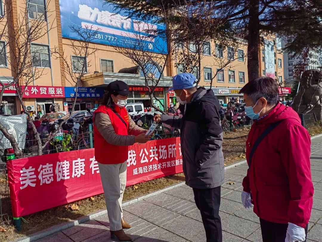 ??????環翠區組織志愿者對轄區的大型商超、農貿市場、步行街等進行文明倡導,通過易拉寶海報、電子屏展示等方式,向行人居民普及戴口罩的重要性,并發放口罩1000余個,倡導大家公共場所戴好口罩、掃描公共場所碼,共筑安全屏障。