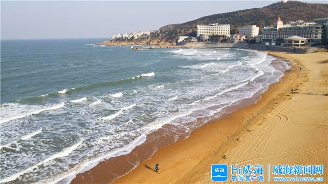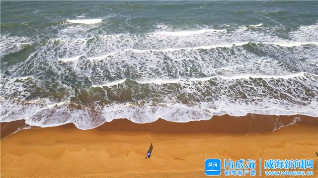 ??????威海國際海水浴場近岸浪花如層層“輕紗”,“披”向金色沙灘。