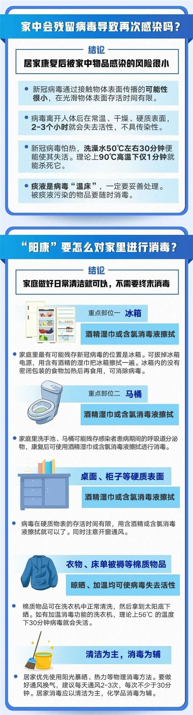 ??????居家康復后,被家中物品感染的風險很小。居家消毒應以清潔為主,做好重點部位消毒即可。提醒:不能不重視消毒,也不能過度消毒。