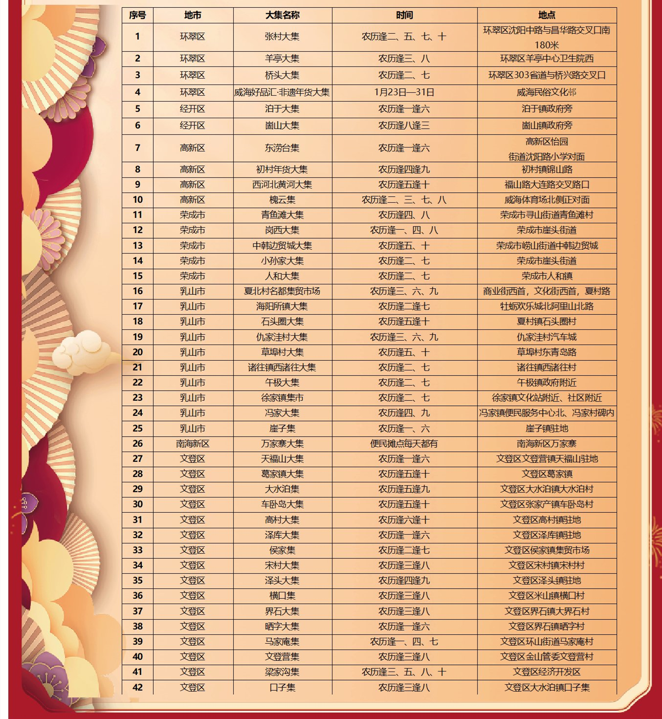 ??????人間煙火最是動人,你想知道咱威海都有哪些大集嗎?記者為您整理好了威海的大集時間表。其中,環(huán)翠區(qū)4個、文登區(qū)15個、榮成市5個、乳山市10個、高新區(qū)4個、經(jīng)開區(qū)2個、南海新區(qū)1個。快在這熱熱鬧鬧、紅紅火火的大集上,感受年味,尋找最平凡樸實的幸福吧!
