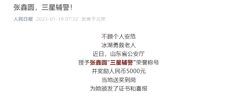 ??????1月19日,人民日報客戶端以《張鑫圓,三星輔警!》為題,介紹威海救人女輔警張鑫圓見義勇為的事跡。以下為報道全文: