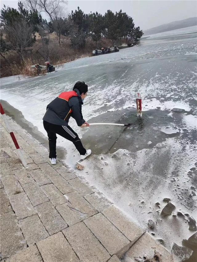 大年初一,在龍角山水庫值守的姜國棟早早起床,由觀讀水位開始拉開了新一年忙碌工作的序幕。由于低溫天氣,水庫的水面結冰,姜國棟需要鑿開冰面觀測水位。一下接著一下,姜國棟拿著鐵鍬將冰面敲破,手指被凍得僵硬,臉也被風吹得通紅,但是他沒有絲毫退卻。“2023年春節(jié)是我入職以來的第一個春節(jié),作為新進的青年水文人,能夠在這個特殊的節(jié)日,堅守崗位,守護萬家燈火,我感到無比榮幸。”姜國棟說。
