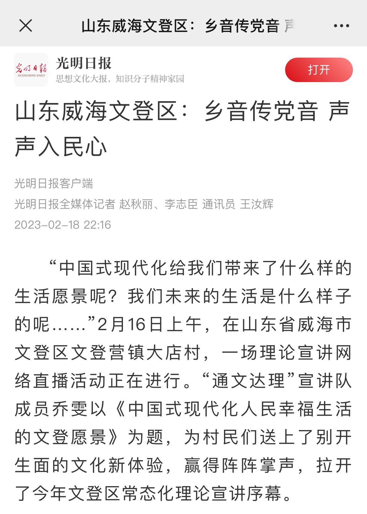 ??????2月18日,光明日報(bào)客戶端聚焦威海,發(fā)布文章《山東威海文登區(qū):鄉(xiāng)音傳黨音 聲聲入民心》,重點(diǎn)報(bào)道文登區(qū)學(xué)習(xí)宣傳貫徹黨的二十大精神宣講情況。以下為報(bào)道全文——