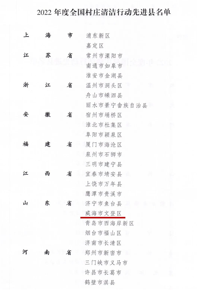 近日,農業農村部、國家鄉村振興局印發《關于通報表揚2022年全國村莊清潔行動先進縣的通知》,對94個措施有力、成效突出、群眾滿意的村莊清潔行動先進縣予以通報表揚,文登區成功入選!