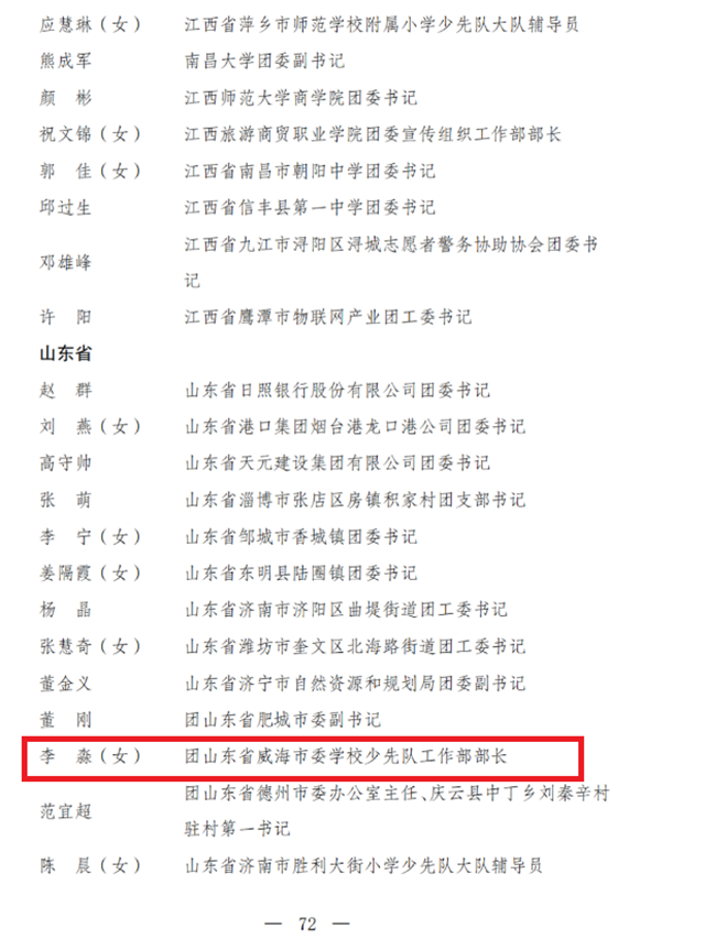??????2023年是全面貫徹落實黨的二十大精神的開局之年。近日,共青團中央作出表彰決定,授予296個團組織全國五四紅旗團委稱號,威海職業學院團委獲此殊榮;授予389個團組織全國五四紅旗團支部稱號,山東省威海市威達集團有限公司團支部獲此殊榮;授予481名同志(含追授1名)全國優秀共青團員稱號,威海第一中學學生王思元、中華人民共和國威海海事局船舶交通管理中心行政執法員孔維新獲此殊榮;授予342名同志全國優秀共青團干部稱號,共青團威海市委學校少先隊工作部部長李淼獲此殊榮。