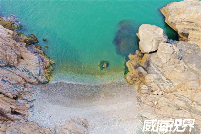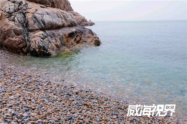 在環翠區靖子頭,藏著一處“秘境桃源”,五彩斑斕的鵝卵石與青山碧海合在一處,如同鵝蛋般光滑的石頭散落沙灘上。礁石抱海,海風習習,行走其間,一天的煩躁與疲憊,似乎都隨長風遠去。