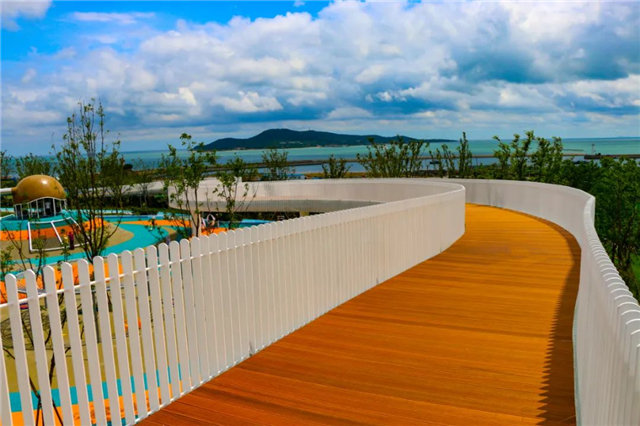 318米的空中棧道,潔白的豎形柵欄配以曲線型的棧道,給人一種簡約明快的視覺美感。站在空中棧道,可以將公園內的園林景觀盡收眼底。