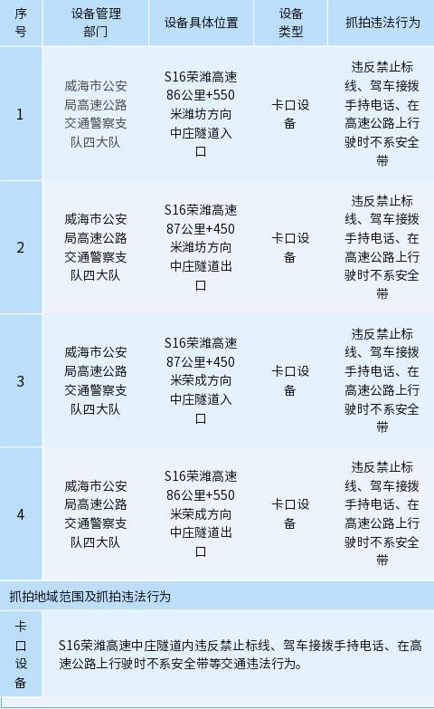 ??????為保證道路交通安全,預(yù)防和減少道路交通事故的發(fā)生,根據(jù)《中華人民共和國道路交通安全法》《公安機(jī)關(guān)執(zhí)法公開規(guī)定》等法律法規(guī),威海市公安局高速公路交通警察支隊(duì)四大隊(duì)新增2處共4個交通技術(shù)監(jiān)控設(shè)備,現(xiàn)予以公示,自5月12日起,將對有關(guān)交通違法行為進(jìn)行依法管理,請廣大交通參與者自覺遵守道路交通法律法規(guī),共同維護(hù)良好的道路交通環(huán)境。
