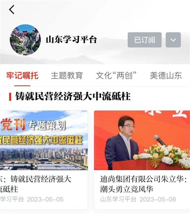 ??????5月6日,“學(xué)習(xí)強(qiáng)國(guó)”山東學(xué)習(xí)平臺(tái)以《迪尚集團(tuán)有限公司朱立華:潮頭勇立競(jìng)風(fēng)華》為題,報(bào)道威海民營(yíng)企業(yè)家朱立華帶領(lǐng)迪尚集團(tuán)實(shí)現(xiàn)高質(zhì)量發(fā)展的典型經(jīng)驗(yàn)。以下為報(bào)道原文: