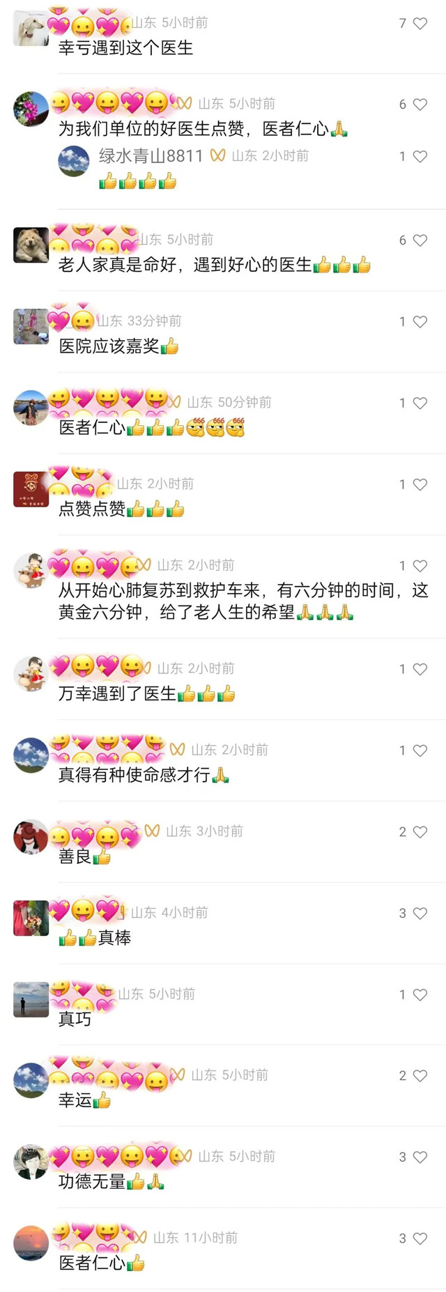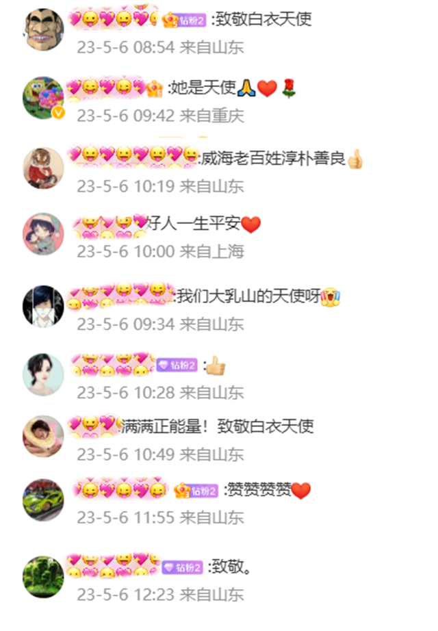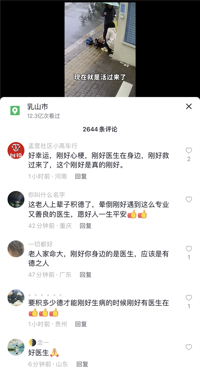 ??????視頻發(fā)布后,引發(fā)網(wǎng)友的廣泛關(guān)注和點(diǎn)贊,#女醫(yī)生雨中跪地急救昏厥老人#沖上了全國微博熱搜榜,“母愛圣地 美好乳山”抖音號(hào)閱讀量12.3億次。網(wǎng)友紛紛在評(píng)論區(qū)留言,為崔亞的舉動(dòng)點(diǎn)贊:“致敬白衣天使!”“滿滿的正能量!” “仁者醫(yī)心!”“黃金六分鐘,給了老人生的希望”……