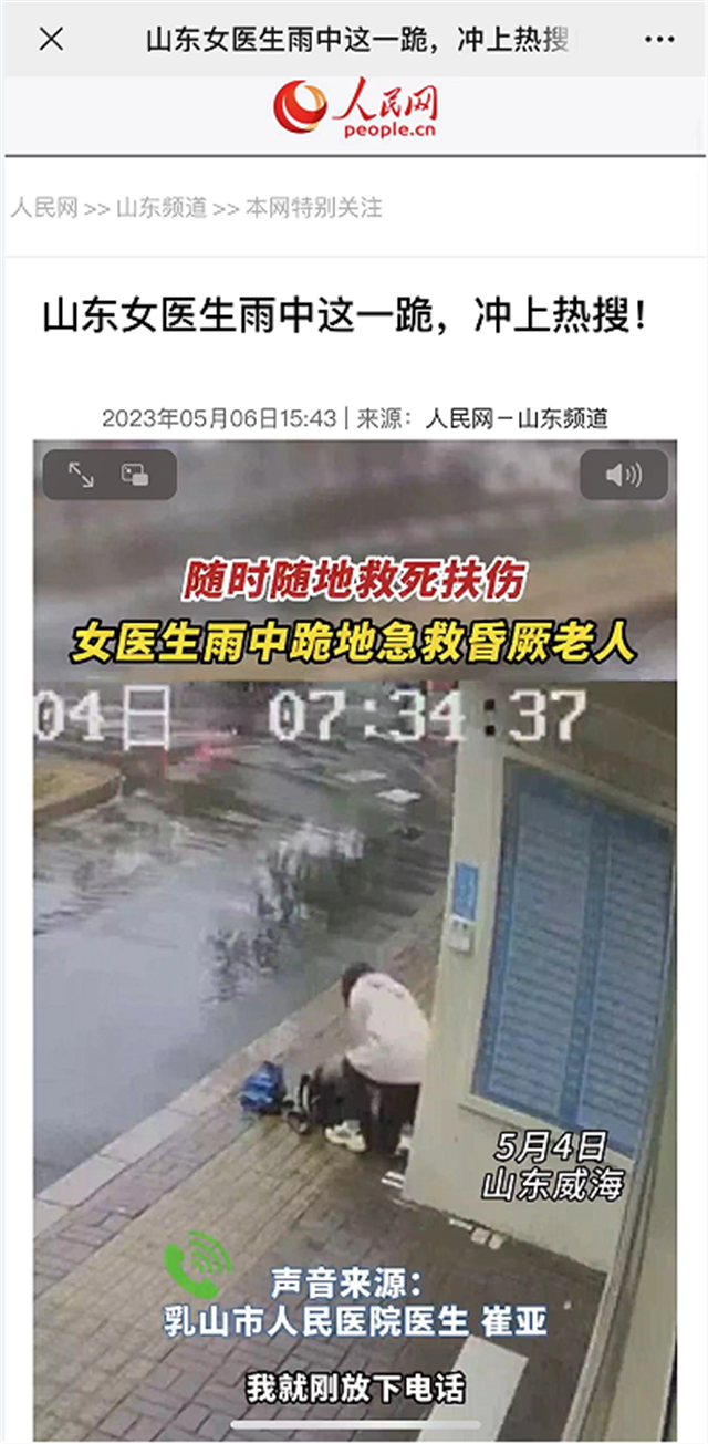??????5月6日,人民網(wǎng)以《山東女醫(yī)生雨中這一跪,沖上熱搜!》為題,聚焦威海乳山市人民醫(yī)院醫(yī)生崔亞,在上班途中救治老人的事跡。以下為報(bào)道全文: