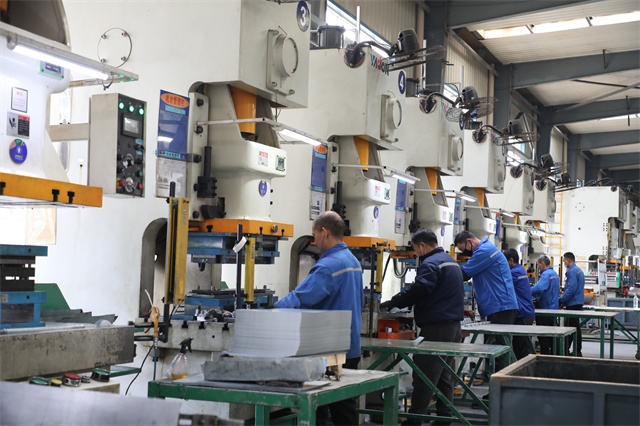 在威海臺(tái)基智能科技有限公司的沖壓車間內(nèi),工人正在加緊生產(chǎn)智能換電柜配件。