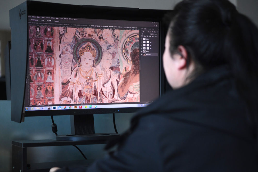 ????敦煌研究院文物數(shù)字化保護(hù)團(tuán)隊(duì)圖像處理人員年海麗在拼接壁畫圖像(2023年4月25日攝)。數(shù)字化探索為莫高窟的保護(hù)與傳承開辟了全新路徑,數(shù)字技術(shù)讓敦煌文物走出洞窟,跨出國門,走向“永久保存、永續(xù)利用”。