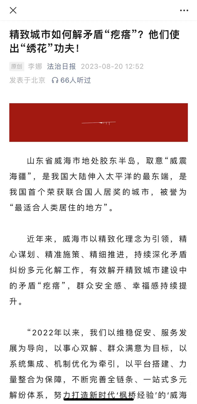 近日,法治日報微信公眾號頭條以《精致城市如何解矛盾“疙瘩”?他們使出“繡花”功夫!》為題,推介威?!耙徽臼健泵芗m紛多元化解典型案例、做法,以下為報道全文: